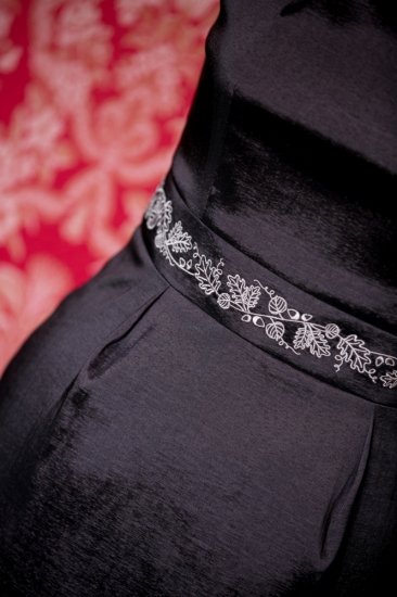Lehoučké šaty příjemného střihu zdobené výšivkou trochu výš nad pasem Vás opticky protáhnou a odhalí Vám ramena. Samotné šaty se dají využít na společenské, ale i akademické povinnosti. K šatům nabízíme do kompletu krásný kabátek, jehož provedení myslí na všechny detaily, které se ženám nesmějí upírat: vyštíhlený pas, vyštíhlené rukávy, potažené knoflíky, zdobení výšivkou. Na šaty samotné, přes ramena, pokud by to etiketa nebo chlad vyžadovaly, doporučujeme použít jemnou šálu.