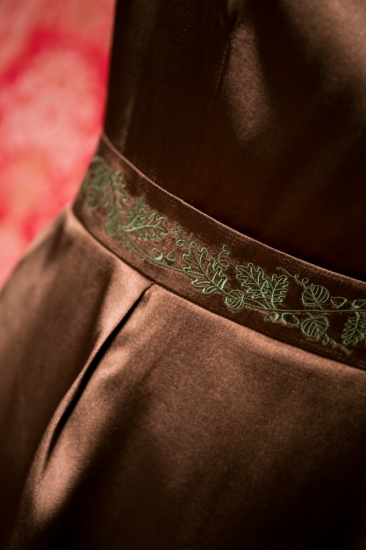 Lehoučké šaty příjemného střihu zdobené výšivkou trochu výš nad pasem Vás opticky protáhnou a odhalí Vám ramena. Samotné šaty se dají využít na společenské, ale i akademické povinnosti. K šatům nabízíme do kompletu krásný kabátek, jehož provedení myslí na všechny detaily, které se ženám nesmějí upírat: vyštíhlený pas, vyštíhlené rukávy, potažené knoflíky, zdobení výšivkou. Na šaty samotné, přes ramena, pokud by to etiketa nebo chlad vyžadovaly, doporučujeme použít jemnou šálu.