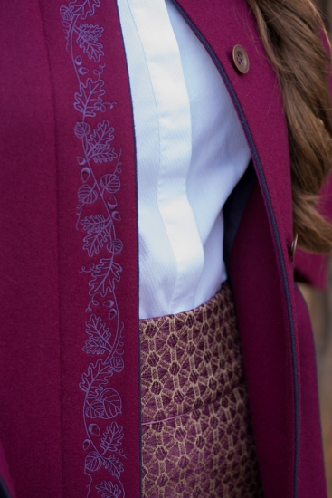 Sukně perfektně ladí k malinovo-švestkovému paletu. Tato kombinace je naším nejteplejším a nejvřelejším pohledem do dámských pocitů. Luxusní vysokogramážní žinylka je měkká i hebká na dotyk, vhodná pro jarní a podzimní období a doplnění celého modelu ( sukně-paleto ) koženou obuví, vyššími rukavicemi a dalšími doplňky Vás přenese do holčičího nebe.