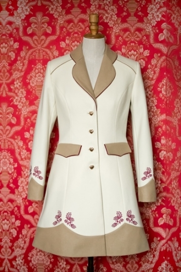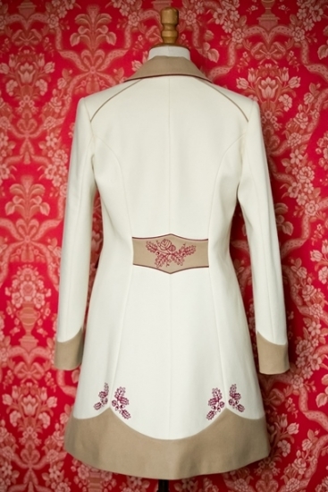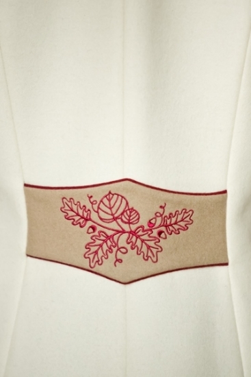 Některé vlněné kabáty šijeme jen mimořádně. Vznikají kombinacemi kousků vlny, která už nevystačí na více kusů. Každá nová várka vlny může mít totiž maličko jiný odstín, a tak z těchto kousků nemá smysl kompletovat řádně, ale mimořádně! Vždyť právě to mimořádné se stává velkou škálou objevů a radosti. Vynikající, velmi elegantní barevná kombinace do společnosti ke skutečné reprezentaci. Vrchní oděv na šaty, vhodný oděv na váženou návštěvu nebo koncert atd. Uchvátila Vás barva slonové kosti? Nádherně ladí s kontrastními výšivkami. Také kontrastní podšívka podtrhuje kouzlo okamžiku i při takové chvíli jako je odkládání oděvu.